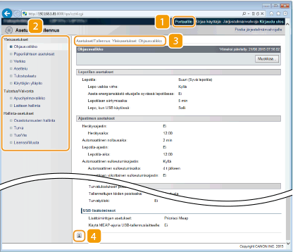 Näyttää [Asetukset/Tallennus]-sivun. Kun olet kirjautunut sisään hallintatilassa, voit muuttaa asetuksia ja tallentaa/ladata rekisteröityjä tietoja.