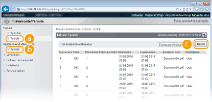 Valitse pysäytetyn asiakirjan tai turvatulostusasiakirjan [Työnumero], jos haluat nähdä tarkat tiedot. Voit tarkistaa tulostetun asiakirjan käyttäjänimen ja sivumäärän.