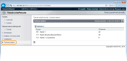 Tehtaan oletusasetukset estävät eräiden toimenpiteiden, kuten tulostettavan asiakirjan poistamisen tai tulostustyön keskeyttämisen, suorittamisen yleisessä käyttäjätilassa. Jos haluat käyttää asiakirjoja yleisessä käyttäjätilassa, kirjaudu hallintatilaan ja ota [Salli tavallisen käyttäjän työtoiminto] käyttöön. Asiakirjojen käytön salliminen loppukäyttäjille