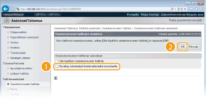 Jos valintaruutu tyhjennetään, käyttäjät eivät voi tulostaa käyttämällä tapaa, jota osastotunnusten hallinta ei tue, tai suorittaa suoratulostusta etäkäyttöliittymästä, johon käyttäjät kirjautuvat hallintatilassa.