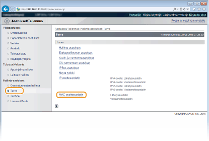 Jos MAC-osoitteet on syötetty väärin, et ehkä pysty käyttämään laitetta Etäkäyttöliittymästä, missä tapauksessa sinun on asetettava <Osoitesuodatin>-asetukseksi <Ei>. Osoitesuodatin