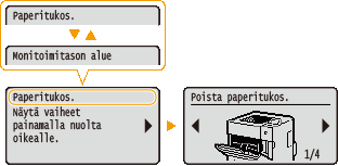 . Jos näytön menettelyjä on vaikea ymmärtää, katso tietoja paperitukosten poistamisesta seuraavista osioista. Jos paperitukos tapahtuu useassa paikassa samaan aikaan, tarkista kaikki esiin tulevat ilmoitukset. Lue kohdan Tärkeitä turvallisuusohjeita varotoimet huolellisesti, ennen kuin aloitat paperitukosten poistamisen.