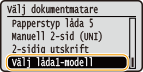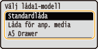 När du använder tillbehörskassetten för A5 eller anpassade media måste du ange <Välj låda1-modell>. Du behöver även återigen ange inställningen till <Standardlåda> när du byter ut den extra papperslådan mot standardpapperslådan.