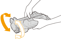 Skaka tonerpatronen fem eller sex gånger enligt nedan så att tonern fördelas jämnt i patronen och lägg den sedan på en plan yta.