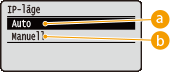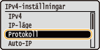 .Du kan endast använda ett av protokollen DHCP, BOOTP och RARP. Om det valda protokollet anges till <På> anges de två övriga protokollen automatiskt till <Av>.