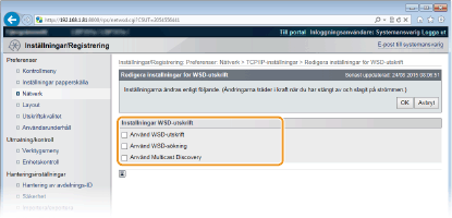 Markera kryssrutan om du vill ha information om enheten från en dator via WSD. Den här kryssrutan markeras automatiskt när kryssrutan [Använd WSD-utskrift] markeras.