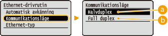 Välj <Halvduplex> eller <Full duplex> ![]() ![]() <Halvduplex>Sänder och tar emot kommunikationsdata alternerande. Välj det här alternativet om enheten är ansluten till en nätverksenhet med halv duplex.