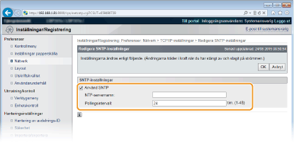 Testa kommunikation med NTP/SNTP-servernDu kan visa kommunikationsstatus med den registrerade servern genom att klicka på [Inställningar/Registrering]