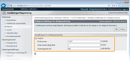 Ändra portnummer för den här funktionen som stämmer med nätverksmiljön. [Antal routrar att gå förbi]