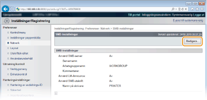 Ett arbetsgruppsnamn som anges i [Arbetsgruppnamn för SMB] under [WINS-konfiguration] används automatiskt för [Arbetsgruppsnamn] i förekommande fall. Om du ändrar servernamnet i [Arbetsgruppsnamn] ändras även [Arbetsgruppnamn för SMB] under [WINS-konfiguration].