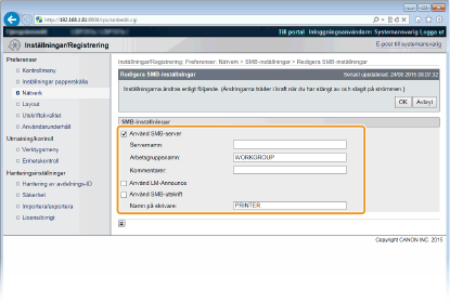 Om du vill ange servernamnet som ska visas i SMB-nätverket kan du använda upp till 16 tecken beroende på teckentyp. Namnet måste vara unikt i nätverket.