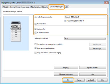 Du kan använda PCL6-skrivardrivrutinen samt UFR II-skrivardrivrutinen. Tillgängliga utskriftsinställningar kan variera beroende på vilken skrivardrivrutin som används. Mer information får du om du klickar på [Hjälp] på skrivardrivrutinskärmen.