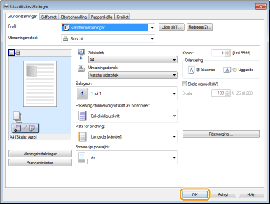 Det är enkelt att ange sidlayout, bindningsplats m.m. på förhandsgranskningsbilden. Mer information får du om du klickar på [Hjälp] på skrivardrivrutinsskärmen.