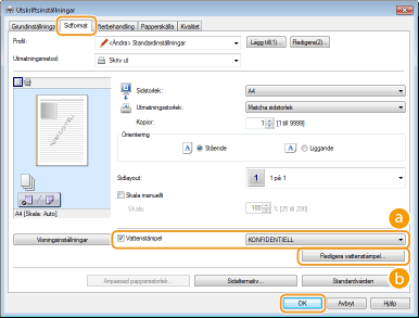 Du kan skriva ut vattenstämplar, till exempel "KOPIA" eller "KONFIDENTIELL", över dokumentet. Du kan skapa nya eller använda förregistrerade vattenstämplar.