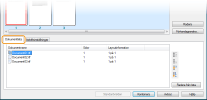 Klicka på fliken [Dokumentlista] för att visa de dokument som lagts till i steg 1 till 4. Du kan ta bort dokument genom att välja dem i listan och klicka på [Ta bort från lista].