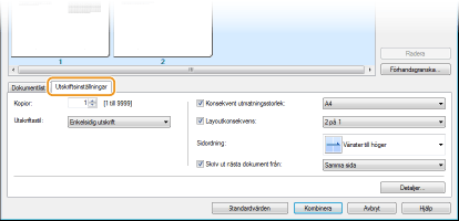 Klicka på fliken [Utskriftsinställningar] för att visa den skärm där du anger utskriftsinställningar, till exempel antal kopior och enkelsidig/dubbelsidig utskrift. Inställningar som görs här används på hela utskriftsjobbet.