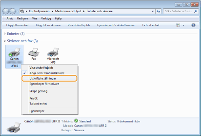 Högerklicka på skrivarikonen och klicka på [Utskriftsinställningar].