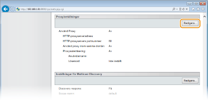 En proxy (eller HTTP-proxyserver) avser en dator eller ett program som utför HTTP-kommunikation för andra enheter, särskilt vid kommunikation med resurser utanför nätverket, till exempel vid surfning på webbplatser. Klientenheterna ansluts till det externa nätverket via proxyservern och kommunicerar inte direkt med externa resurser. Att ställa in en proxy underlättar hanteringen av trafik mellan interna och externa nätverk men blockerar också obehörig åtkomst och befäster antivirusskyddet vilket ger utökad säkerhet. När du använder Google Cloud Print för att skriva ut över Internet, kan du öka säkerheten genom att ställa in en proxy. När du ställer in en proxy måste du se till att du har nödvändig proxyinformation, däribland IP-adress och portnummer samt ett användarnamn och lösenord för autentisering.