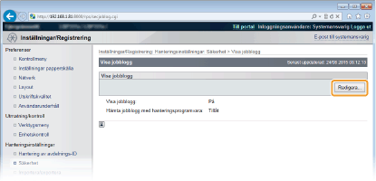 Om du markerar kryssrutan kan du använda enhetshanteringsprogram som t.ex. imageWARE Enterprise Management Console för att hämta utskriftshistorik. Avmarkera kryssrutan för att förhindra att hanteringsprogram hämtar utskriftshistoriken. Den här funktionen aktiveras automatiskt när kryssrutan [Visa jobblogg] markeras.