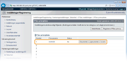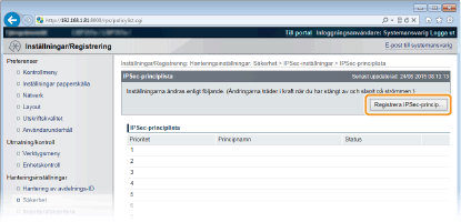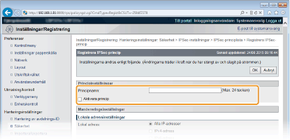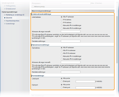 Använda IPSec med IP-adressfilterIPSec-inställningar används före IP-adressfilterinställningarna under paketmottagning, medan IP-adressinställningarna används före IPSec-inställningarna vid paketsändning. Ange IP-adresser för brandväggsregler