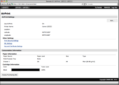 Можно также отобразить экран AirPrint, с помощью которого можно не только получить доступ к настройкам AirPrint, но и просматривать информацию о расходных материалах, например о бумаге и картридже с тонером. Кроме того, можно настроить параметры безопасности (