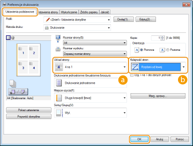 W sekcji [Układ strony] określ liczbę stron, która ma zostać wydrukowana na jednym arkuszu