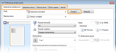 Kliknij kolejno zakładki [Ustawienia podstawowe], [Ustawienia strony], [Wykończenie], [Źródło papieru] lub [Jakość], aby skonfigurować ustawienia wydruku na każdym ekranie w zależności od potrzeb.