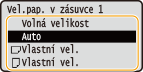Pokud často měníte velikost podávaného papíru, můžete zadat <Volná velikost>, což vám ušetří nutnost měnit velikost papíru při každém tisku. Pamatujte však, že velikost papíru nastavená v ovladači tiskárny není v tomto případě zkontrolována.