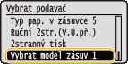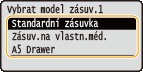 Pokud používáte volitelnou kazetu A5 nebo vlastní kazetu na média, musíte zadat <Vybrat model zásuv.1>. Musíte také změnit nastavení zpět na <Standardní zásuvka>, pokud místo volitelné zásuvky na papír chcete používat standardní zásuvku na papír.