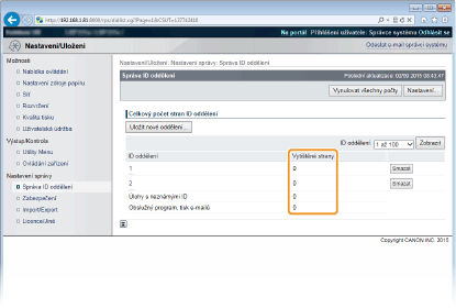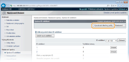 Vytištění výsledku kontrolyVymazání počtu stránek na nuluPokud chcete vymazat počtu stránek na nulu pro každé oddělení, klikněte na textový odkaz v části [ID oddělení] a klikněte na [Vynulovat počet]