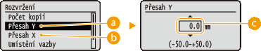 Můžete vybrat <Uprav. polohu tisku> v části <Uživatelská údržba> pro jemné zadání pozice tisku pro každý zdroj papíru. Rozsah dostupných hodnot přesahu je od -5,0 až +5,0 mm. Nastavení pozice tisku