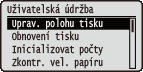 Nastavení týkající se úpravy zařízení, včetně korekce pozice tisku pro každý zdroj papíru a zlepšení kvality tisku, jsou uvedeny s krátkými popisy. Tato nastavení můžete zadat, když je zařízení offline. Výchozí nastavení jsou označena křížkem (