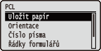 Všechna nastavení týkající se řídicích příkazů PCL jsou uvedena s krátkým popisem. Výchozí nastavení jsou označena křížkem (