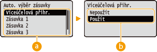 Když je možnost <Vú. přih. smíš. pap.> nastavena na <Zap>, je papír přednostně podáván ze zásuvky na papír, i když je možnost <Priorita víceúč. př.> nastavena na <Zap>.