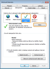 Vyberte možnost [Důvěryhodné servery] na kartě [Zabezpečení] a klikněte na [Weby].