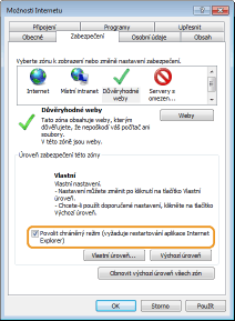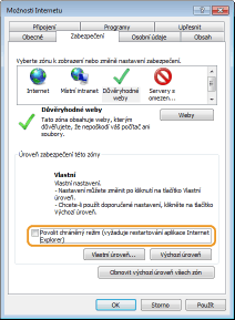 Pokud jste zrušili zaškrtnutí políčka [Povolit chráněný režim (vyžaduje restartování aplikace Internet Explorer)] v kroku 7, zaškrtnutí obnovte.