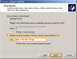 Vyberte možnost [Připojit k tiskárně v Internetu nebo v domácí či podnikové síti:], zadejte cíl připojení a klikněte na tlačítko [Další].