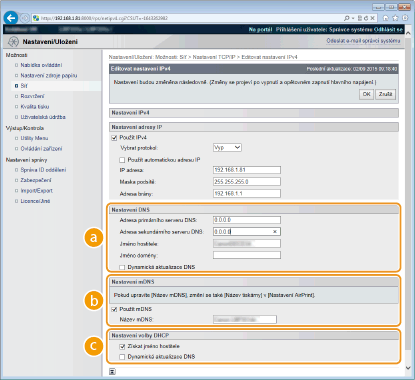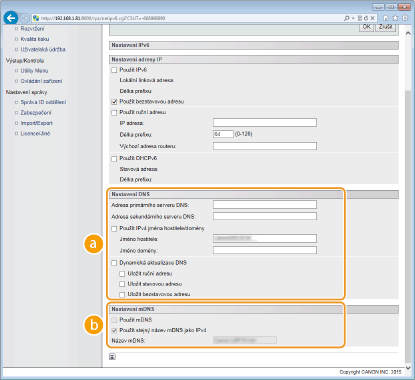 Políčko zaškrtněte, pokud chcete dynamicky aktualizovat záznamy služby DNS po každé změně IP adresy zařízení. Pro zadání typů adres, které chcete zaregistrovat na serveru DNS, zaškrtněte políčko [Uložit ruční adresu], [Uložit stavovou adresu] nebo [Uložit bezstavovou adresu]. [Nastavení mDNS]/[Nastavení volby DHCP][Použít mDNS]