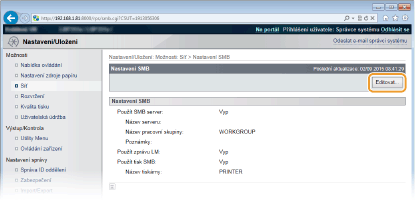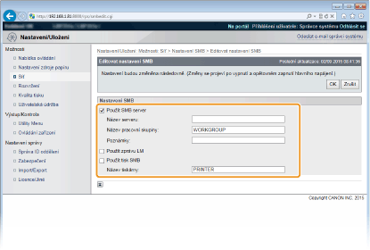 Název serveru zadaný v [Název serveru SMB] pod [Konfigurace WINS]se automaticky použije pro případný [Název serveru]. Změna názvu serveru v [Název serveru] se provede také v [Název serveru SMB] pod [Konfigurace WINS].