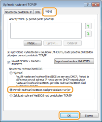 Klikněte na kartu [WINS], vyberte možnost [Povolit rozhraní NetBIOS nad protokolem TCP/IP] a potom klikněte na [OK].