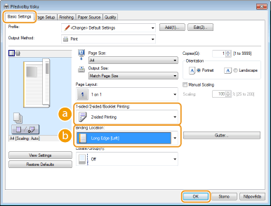 Vyberte možnost [1-sided Printing] (Jednostranný tisk) nebo [2-sided Printing] (Oboustranný tisk) v [1-sided/2-sided/Booklet Printing] (1stranný tisk / oboustranný tisk / tisk brožury)