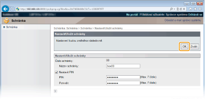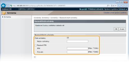 Pro otevření daného boxu můžete zadat název a PIN. Pokud boxu zadáte čitelné jméno, budete ho moci snadno rozeznat při výběru místa pro uložení dokumentů pomocí ovladače tiskárny. Pokud zadáte PIN, uložené dokumenty budou moci používat pouze vybraní uživatelé a zvýší se tím zabezpečení dokumentů.