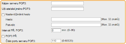 Zadejte interval pro automatické připojení k poštovnímu serveru v minutách. Nové e-maily v poštovní schránce na poštovním serveru se automaticky přijmou a vytisknou v zadaných časových intervalech. Toto nastavení můžete provést také pomocí <Interval PŘ. POP3> v nabídce nastavení na ovládacím panelu (
