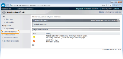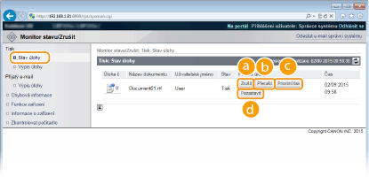 Výchozí nastavení neumožňuje provádění některých operacích v režimu běžného uživatele, například vymazání dokumentu, který se má tisknout, nebo přerušení tiskové úlohy. Pokud chcete pracovat s dokumenty v režimu běžného uživatele, přihlaste se v režimu správce a povolte [Povolit proces úlohy běžného uživatele]. Umožnění manipulace s dokumenty koncovým uživatelům
