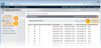 Zobrazí se historie až 16 dokumentů vytištěných jako seznam nastavení a hlášení (až 128 dokumentů, když je vložena karta SD).