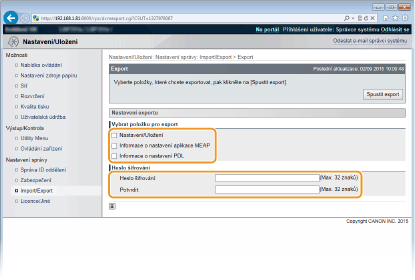 Pokud chcete exportovat data nastavení položek, které lze odeslat z možnosti [Nastavení/Uložení] na stránce portálu, zaškrtněte políčka příslušných položek.