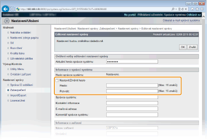 Změna nastavení konfigurovaného v tiskárně ze vzdáleného uživatelského rozhraní vyžaduje administrativní práva. Postupujte podle procedury uvedené níže a změňte heslo správce systému.Informace o nastavení hesla správce systému je klíčová pro zabezpečení tiskárny, proto se ujistěte, že toto heslo znají pouze správci.