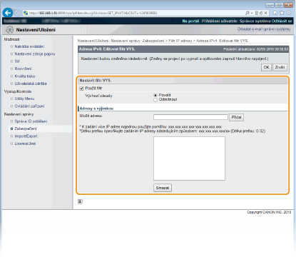 Pokud zadáte IP adresy nebo čísla portů nesprávně, nemusí být možné se k zařízení připojit prostřednictvím Vzdáleného uživatelského rozhraní. V takovém případě je třeba nastavit <Filtr adresy> na <Vyp>. Filtr adresy