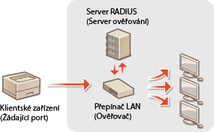 Zařízení se může k síti 802.1X připojit jako klientské zařízení. Typická síť 802.1X sestává se serveru RADIUS (ověřovací server), přepínače LAN (ověřovatel) a klientského zařízení se softwarem umožňujícím ověření (žádající porty). Pokud se zařízení pokusí připojit k síti 802.1X, musí projít procesem ověření uživatele, který prokáže, zda se o připojení pokouší autorizovaný uživatel. Informace o ověření je odeslána ke kontrole na server RADIUS, který na základě výsledku ověření buď povolí, nebo odmítne komunikaci se sítí. Pokud se ověření nezdaří, přepínač LAN (nebo přístupový bod) zablokuje přístup z vnější sítě.