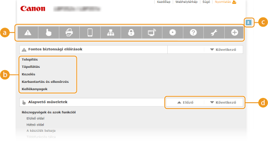 Az e-Kézikönyv különböző képernyőkre van osztva, és a képernyők tartalma változó.